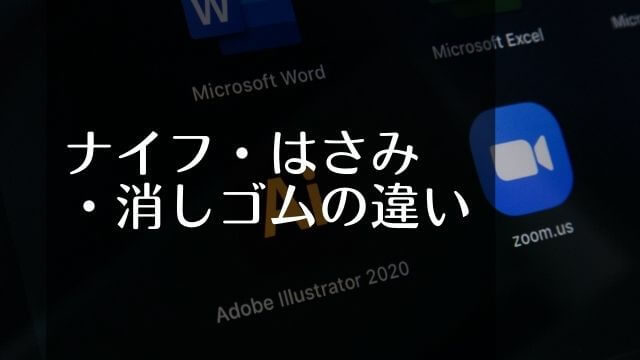 ナイフ,はさみ,消しゴムの違い illustrator 2021.08.10 2021.06.09 目次 ナイフツールはさみツール消しゴムツール ナイフツール ナイフツールは通り越すように切らないと、パスで分けられた領域にならない。予定より小さい破片などができたときは、パスファインダーで結合させたりして処理する。線があるものを切ったときは線端が予想外になることがあるので注意! はさみツール はさみツールはアンカーとアンカーで結んでカットする。 消しゴムツール 消しゴムサイズの変更は「消しゴムツールアイコン」をWクリック。角度・丸さ・サイズが変更できる。 使用例