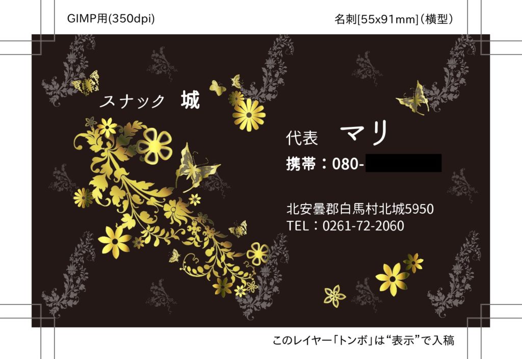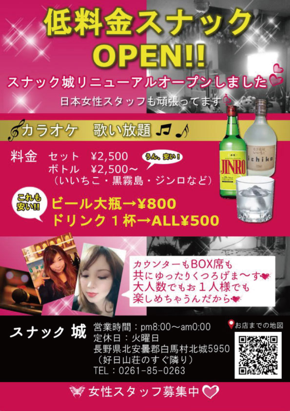 チラシ&名刺デザイン(スナック) 作品集 2021.11.11 A4チラシ 名刺 白馬村のスナック城様のチラシと名刺を作成しましたチラシは他に緑バージョン、名刺はピンクと青も作成しました(スタッフによってお好みで選択)この頃はGIMPを用いて原稿を作成していました